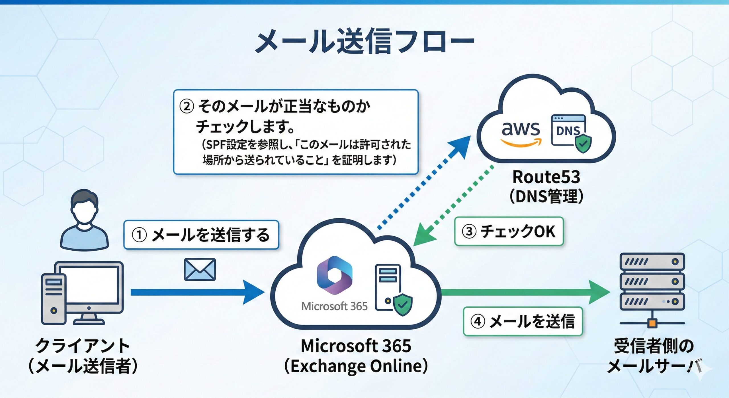 「どのサーバからメールを送るか」を事前に宣言する仕組みです。 受信側は、届いたメールが宣言通りのサーバ(M365など)から来ているかを確認します。