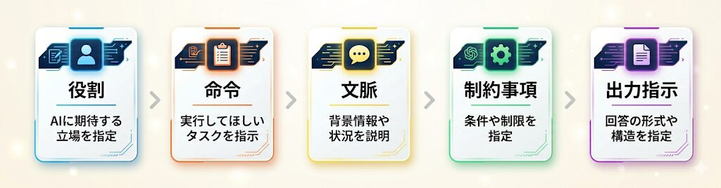 - 5要素(役割・命令・文脈・制約事項・出力指示)を意識するだけで、AIの回答は見違えるほど変わります。