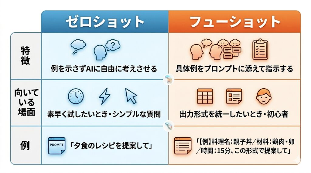 例を1つ見せるだけで、AIが期待する形式を正確に把握できます。初心者にはフューショットがおすすめです。