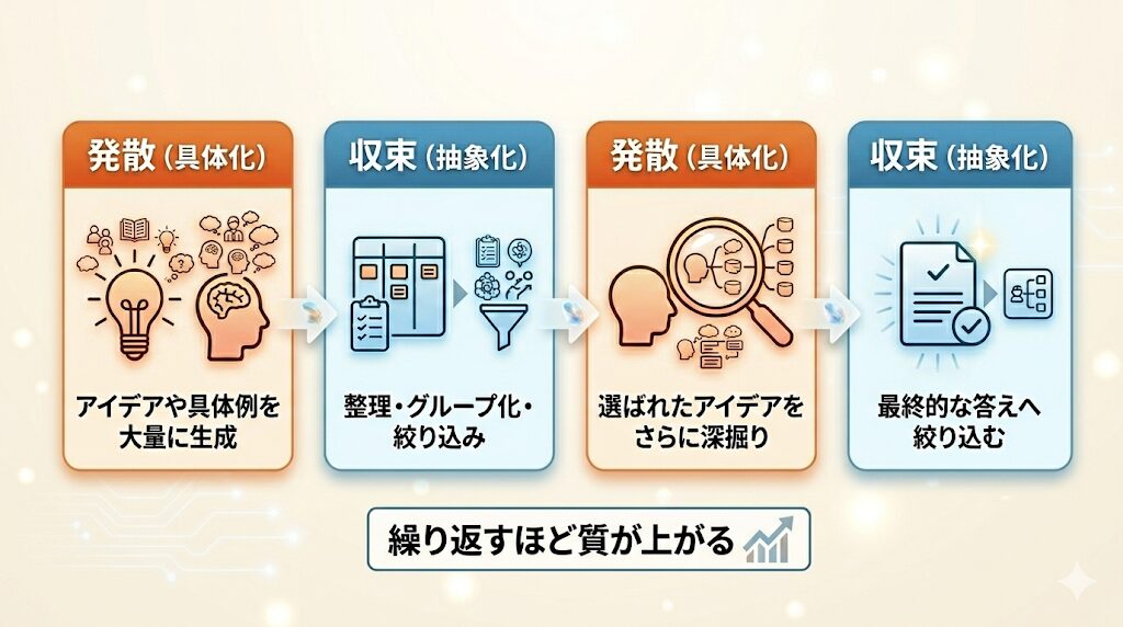 発散(アイデアを大量に出す)と収束(整理・絞り込む)を繰り返す方法です。
