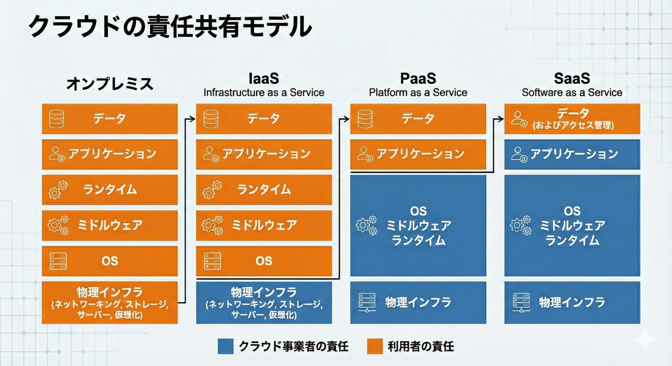 更にクラウドに移行すると"責任共有のモデル"が導入される。クラウドプロバイダーが提供しているレイヤー(サービス)のデータセンターの稼働維持、ネットワーク接続などに関してユーザーは考えなくてよいため、アプリケーションの実装などに専念できるようになる。